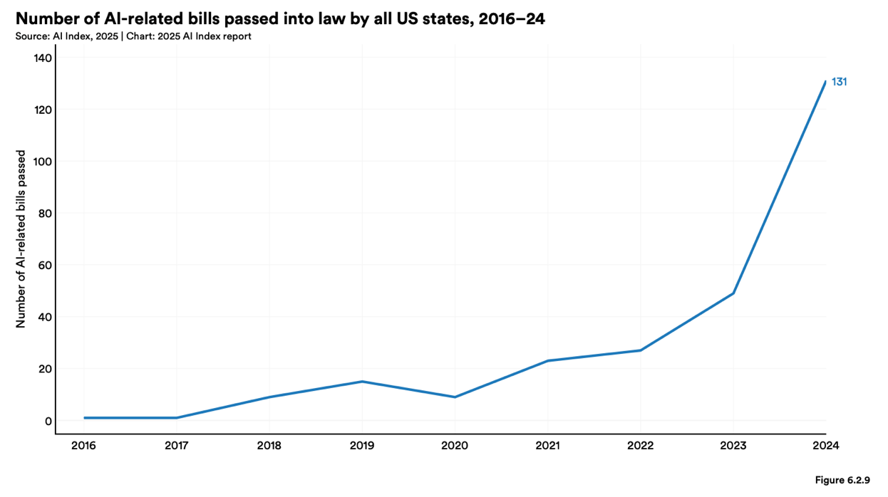 But there is work to be done yet to get past the fragmentation: In 2024 alone, more than 100 AI-related laws were enacted across the United States, reflecting a wide range of approaches. Comprehensive frameworks like the Colorado AI Act (SB 24-205) impose obligations on “high-risk” AI systems to prevent algorithmic discrimination, while laws such as the Texas Responsible AI Governance Act take an intent-based approach to prohibiting harmful uses. Other states, including Utah and California, have focused on transparency, disclosure, and consumer interaction requirements, while sector-specific rules address employment practices, healthcare communications, and even political deepfakes.