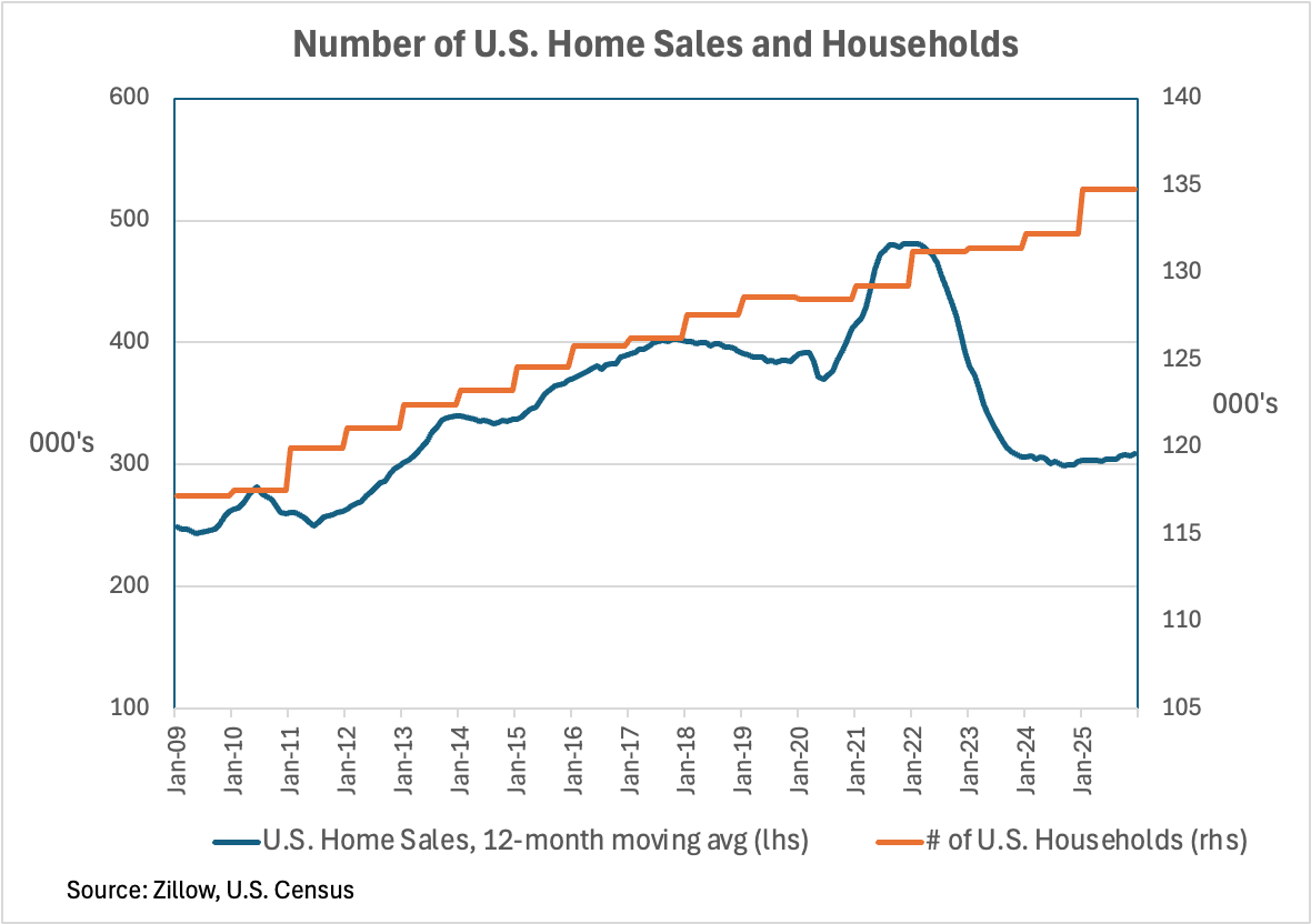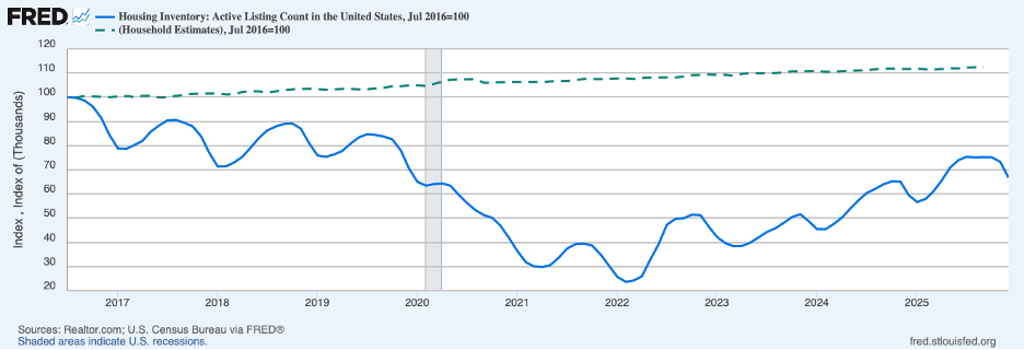 The number of homes actively listed for sale remains low relative to the number of U.S. households: