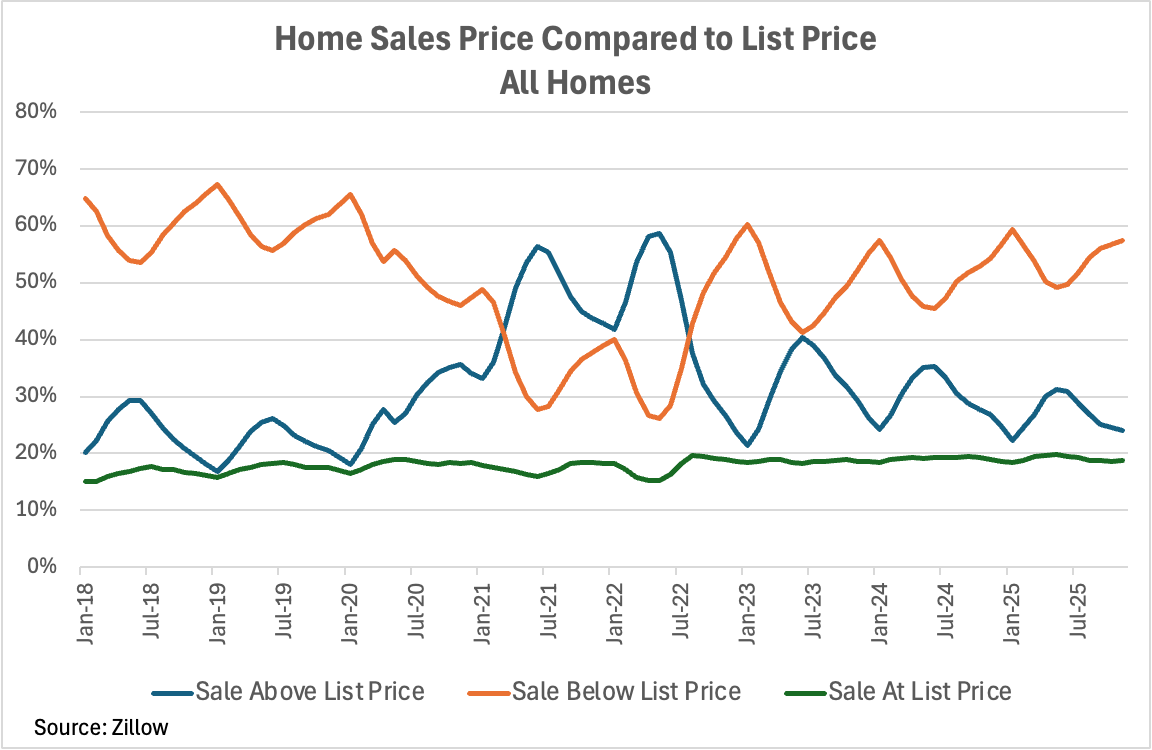 Most homes are now selling at prices below the list price. The share of home sales below list price is seasonal and trending up toward pre-pandemic levels as of late 2025.