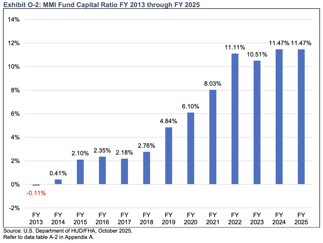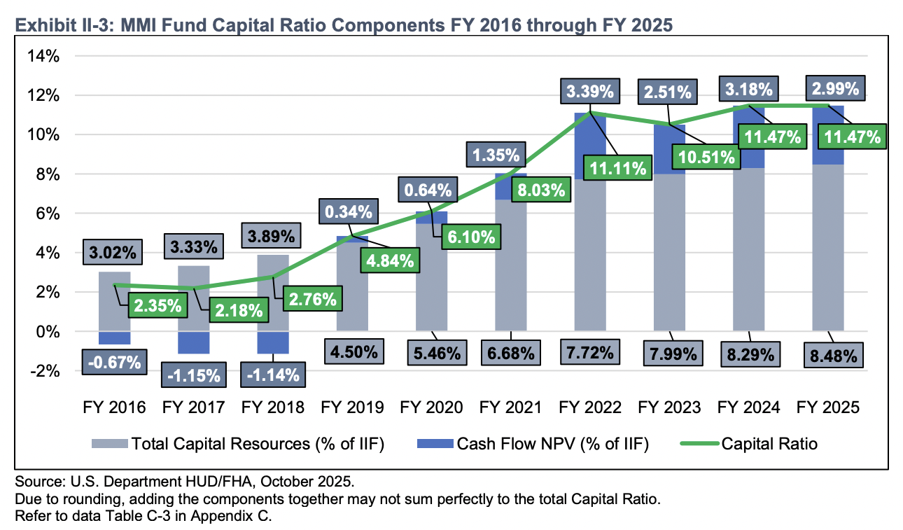 This month, we look at the results of the 2025 Annual Report to Congress Regarding the Financial Status of the Federal Housing Administration Mutual Mortgage Insurance Fund, the subject of Keith Becker’s comments above. The MMI Fund’s Capital totals $189 billion, comprised of the Fund’s Capital Resource -- the collected upfront and monthly insurance premiums, investments, recoveries on disposed assets, and any notes and properties awaiting disposition -- plus the net present value of future expected cash flows. Expressed as a ratio to the Insurance in Force of $1.6 trillion yields a Capital Ratio of 11.47%, unchanged from a year ago. The Capital Ratio for FHA forward mortgages has been relatively flat over the past 4 years while the Capital Ratio of the HECM book has been highly sensitive since the HECM portfolio was added to the MMI Fund in 2009, as seen here: