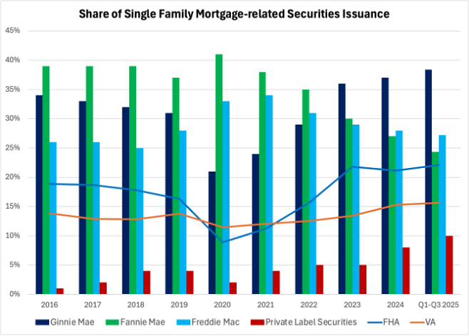 Ginnie Mae share of mortgage-related securities issuance continues to rise and has exceeded Fannie Mae and Freddie Mac individually over the past three years: